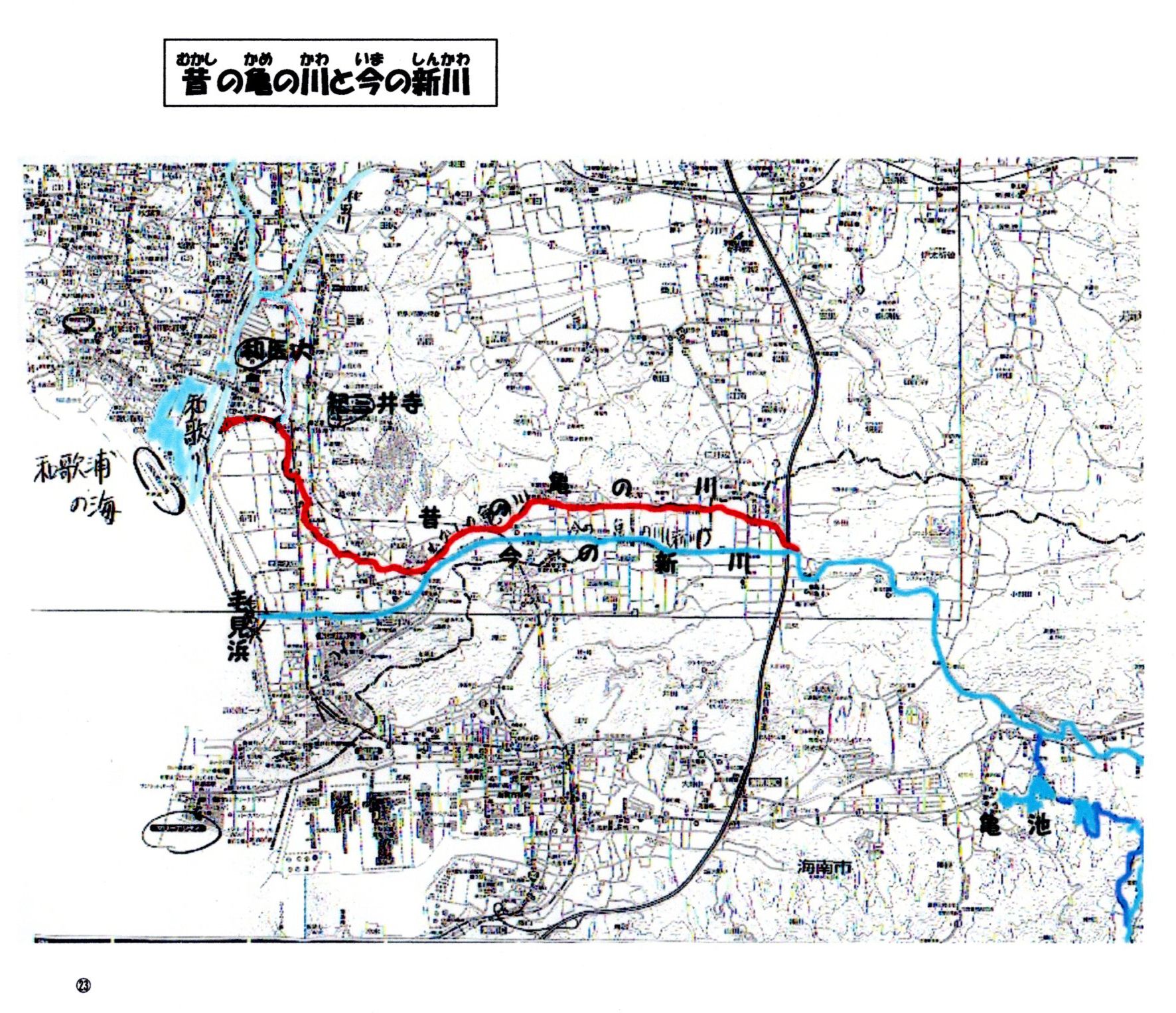 昔の亀の川は、且来→多田→本渡の山裾を通って、現在の紀三井寺川の流路から和歌川の河口へ注いでいたんだ。