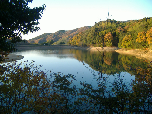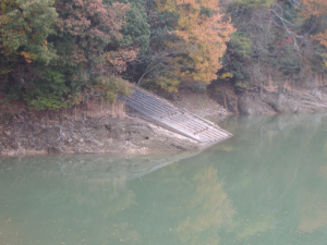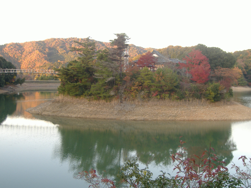 亀池を造る前は、谷田池という小さな池があったって、【*ちょうどつり橋の下の辺りだね。】その池の東側に中山という小山【*今の中島のことだね。】があって、その中山と西の山裾をつないだ堤が今も残っているらしいよ。低い堤だから、いつもは池の水にかくれているけど、水が少ない時には、池の底に見えてくるそうだ。