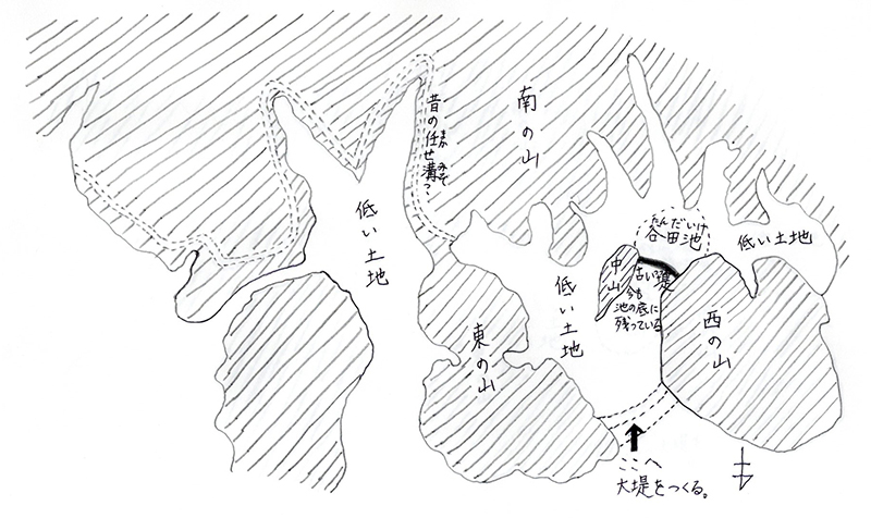 やそべえさんは、中山の周りの低い土地を掘って、谷田池を大きくしようとしたんだな。そして、掘った土をその北側に積んで、高いしっかりした堤を築いた。それが今の亀池だ。