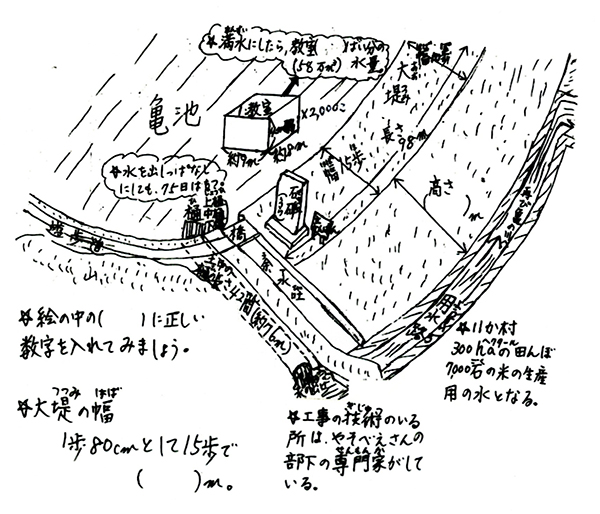 わたしは、亀池の工事のやり方を調べた。今とちがって、機械がない時代だったから、土木工事はすごく大変だなと思ったよ。