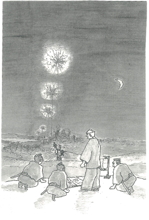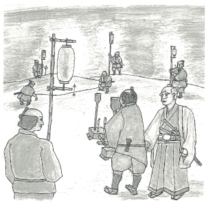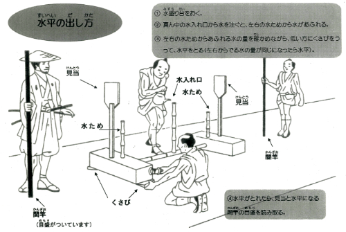 - 測量に使う道具…数本のろうそく、竹ざお、水盛台、ちょうちんなどで夜に測量。